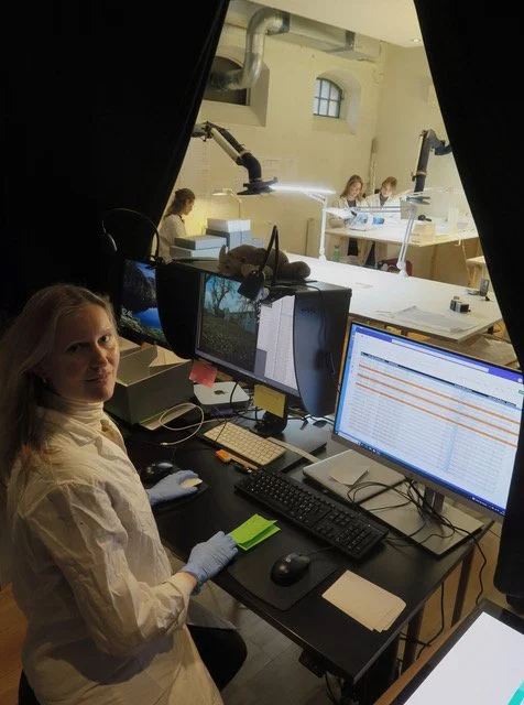 Ingrid Åberg, fotograf sitter vid den arbetsstation där avfotograferingen av negativen sker. Foto: Björn Axel Johansson