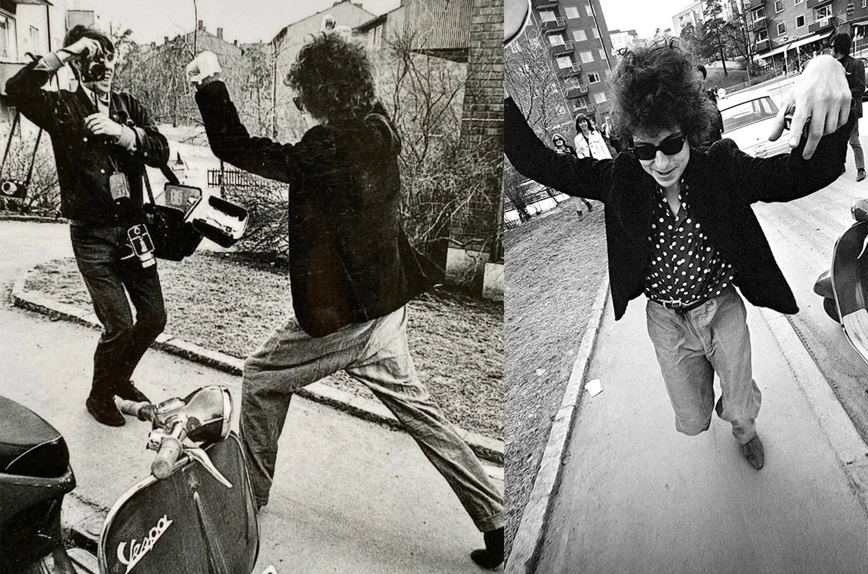 Larsåke Thuresson fotograferar en ovanligt glad och lekfull Bob Dylan på sitt första Sverigebesök 1966.